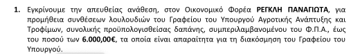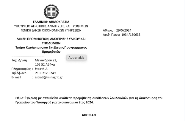 Χαρακτηριστικά: Απόφαση της διεύθυνσης Προμηθειών του υπουργείου Αγροτικής Ανάπτυξης, για την διακόσμηση του υπουργικού γραφείου του Αυγενάκη με «συνθέσεις λουλουδιών», η οποία θα στοιχίσει 6.000 ευρώ για το τρέχον έτος.